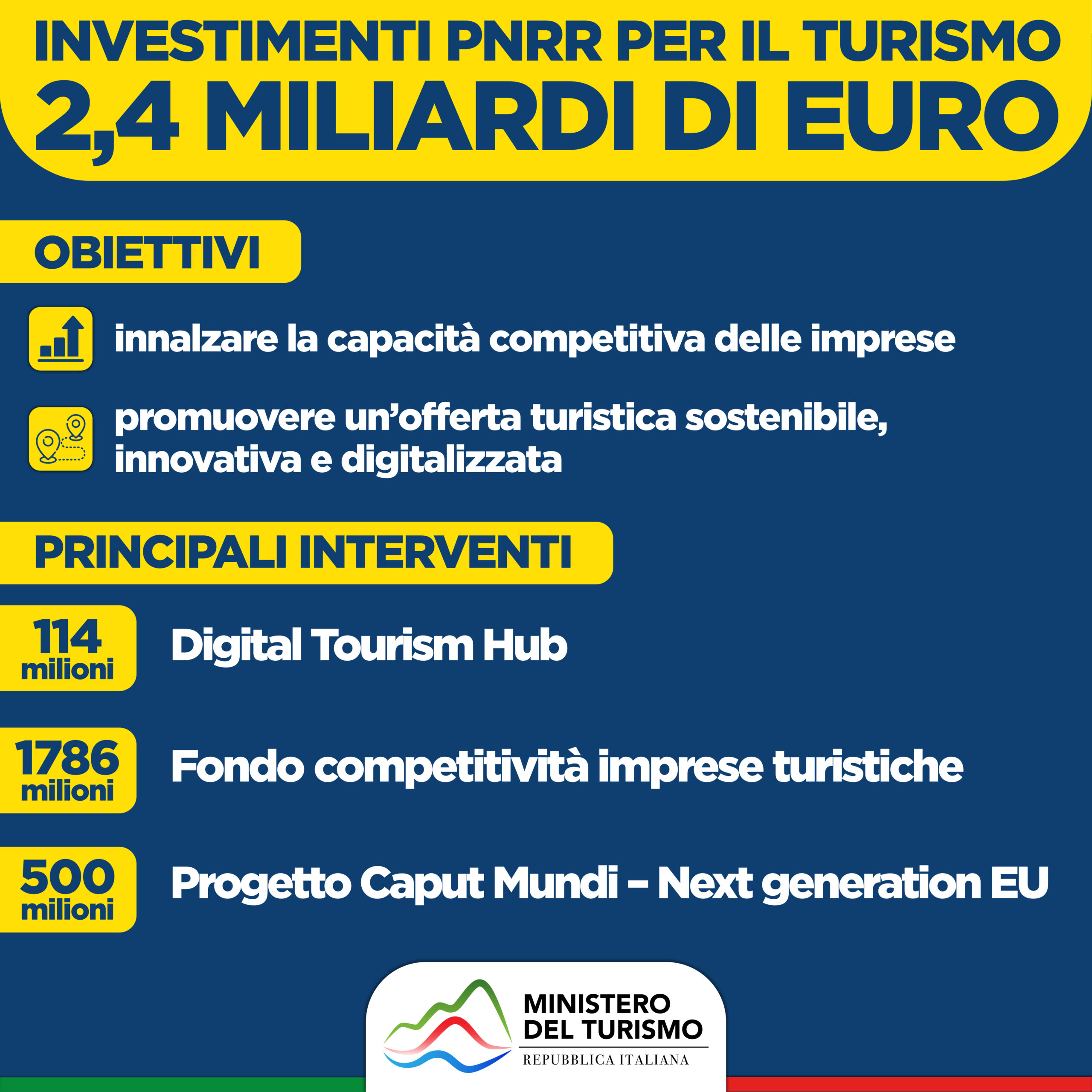 Il “pacchetto Turismo” del Pnrr ammonta complessivamente a 2,4 miliardi.