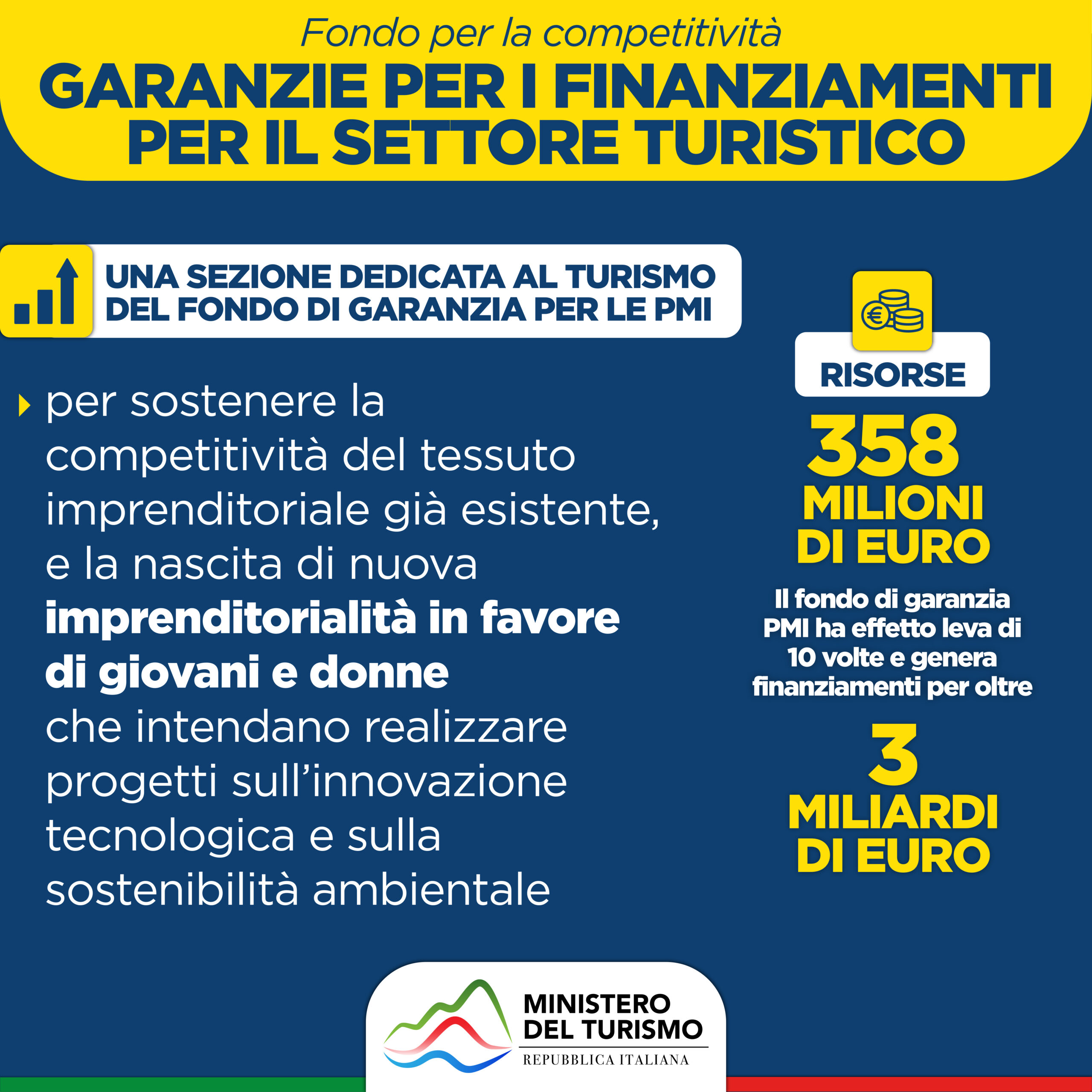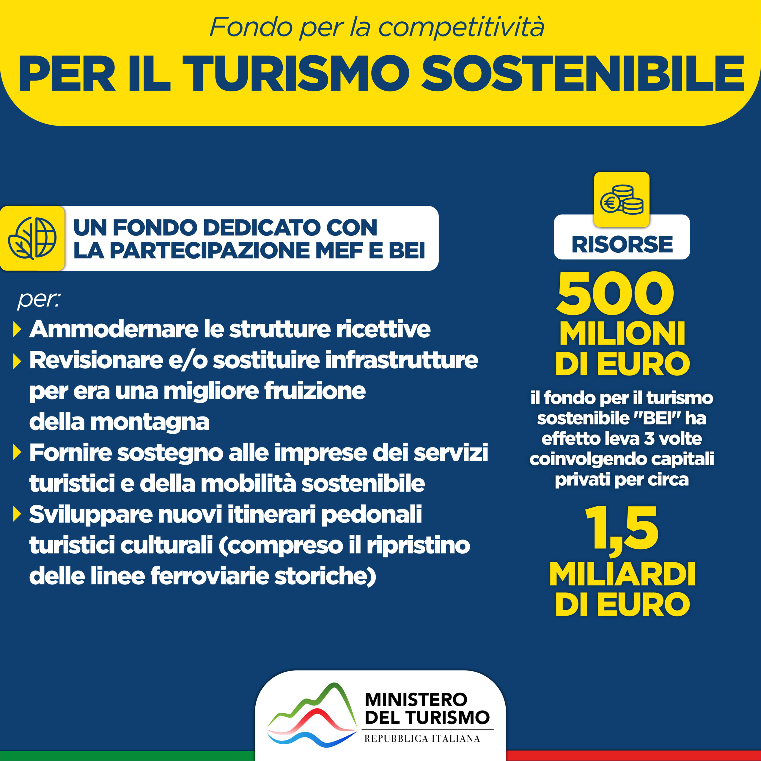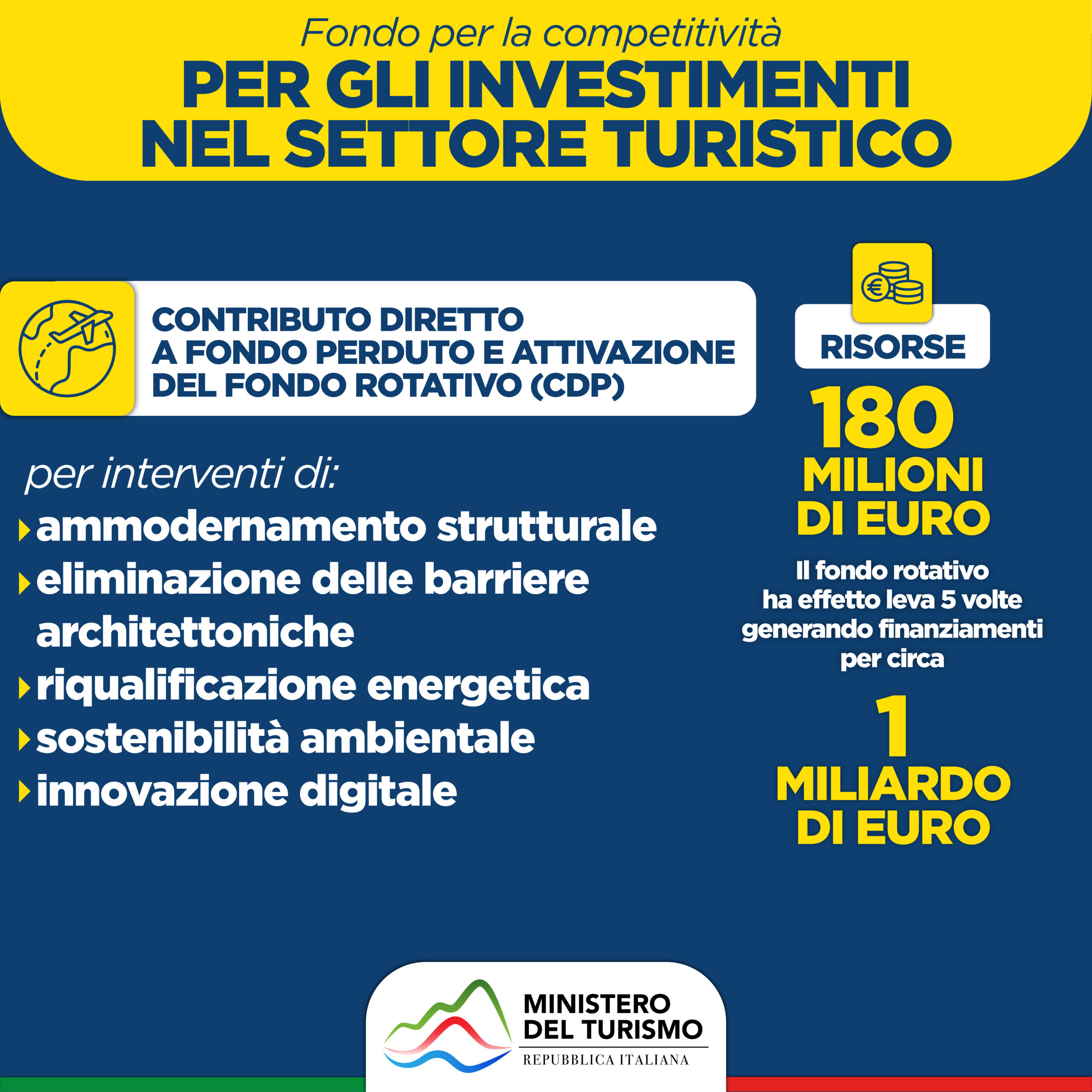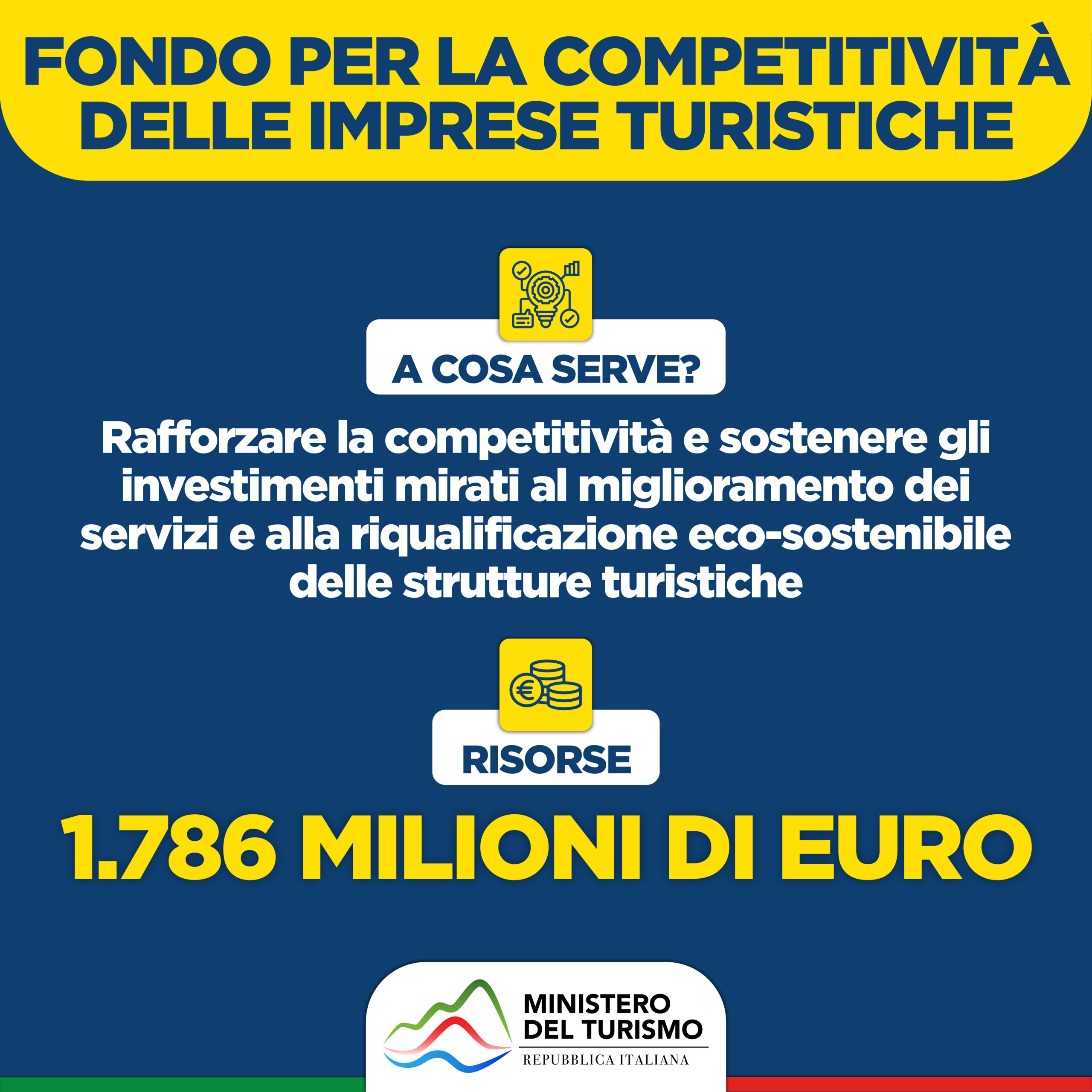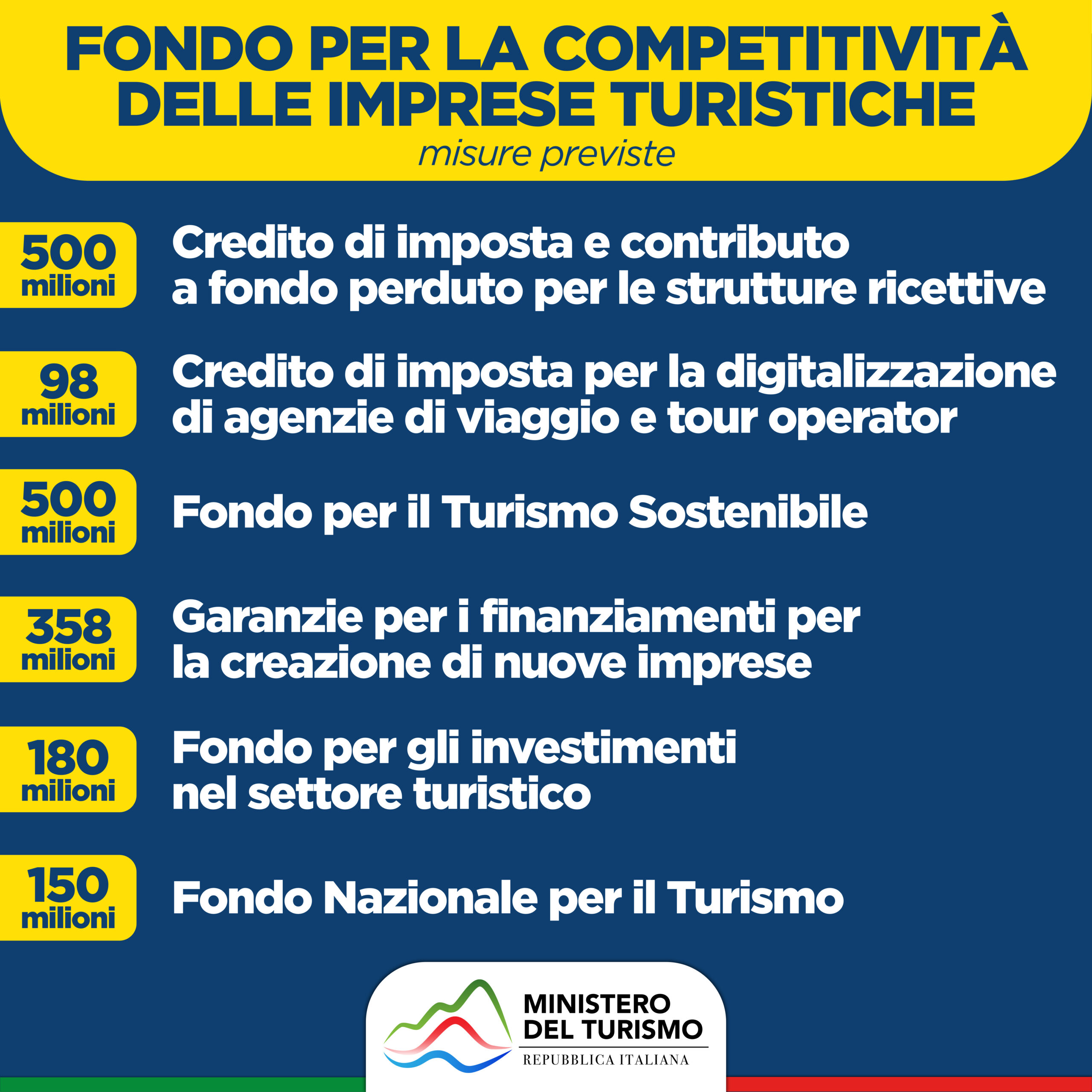 - 1.786 milioni per un Fondo nazionale del Turismo, che comprende sei diversi interventi;