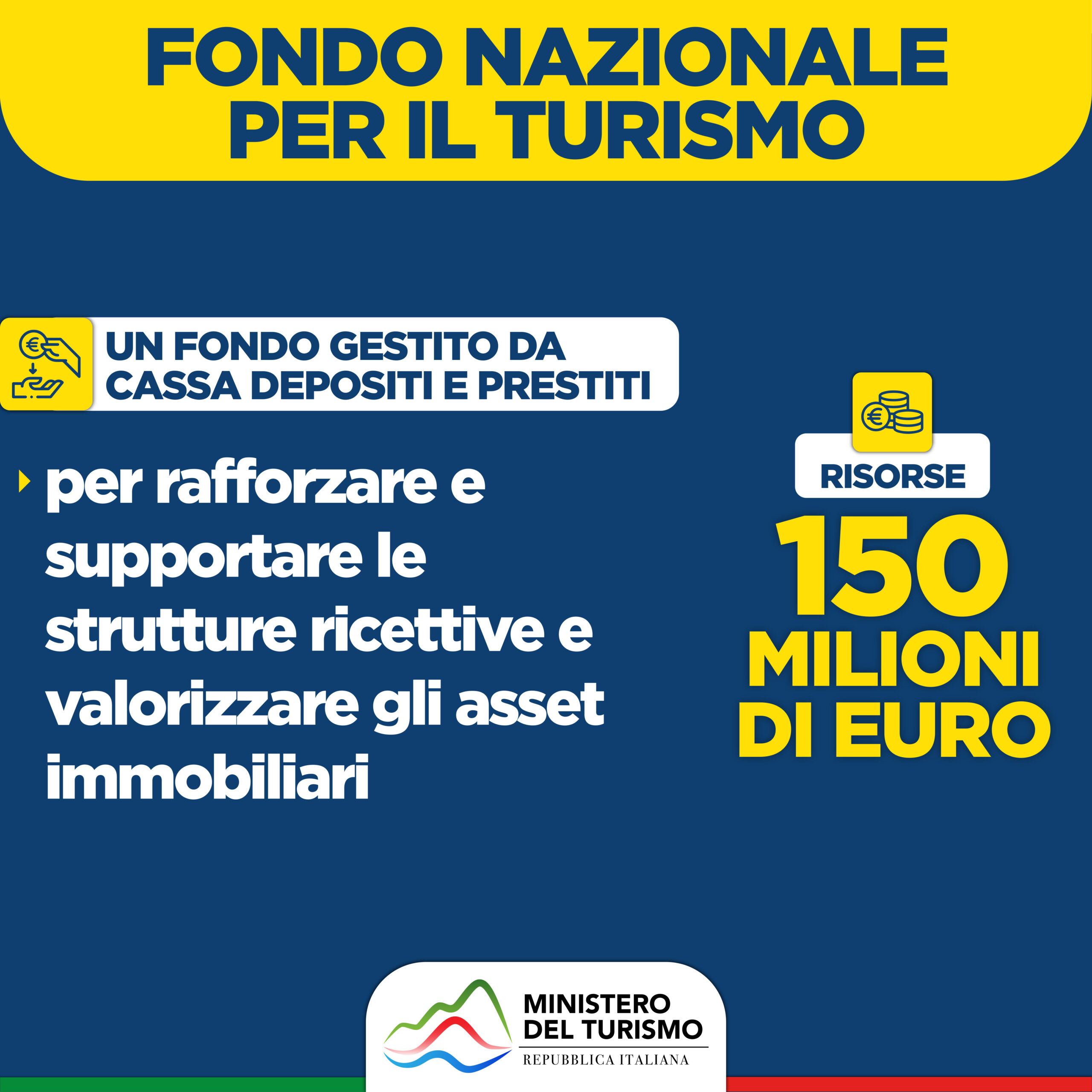 – 150 milioni per il Fondo nazionale per il Turismo, gestito con Cdp, per rafforzare strutture e valorizzare assets immobiliari: seguirà atto amministrativo.