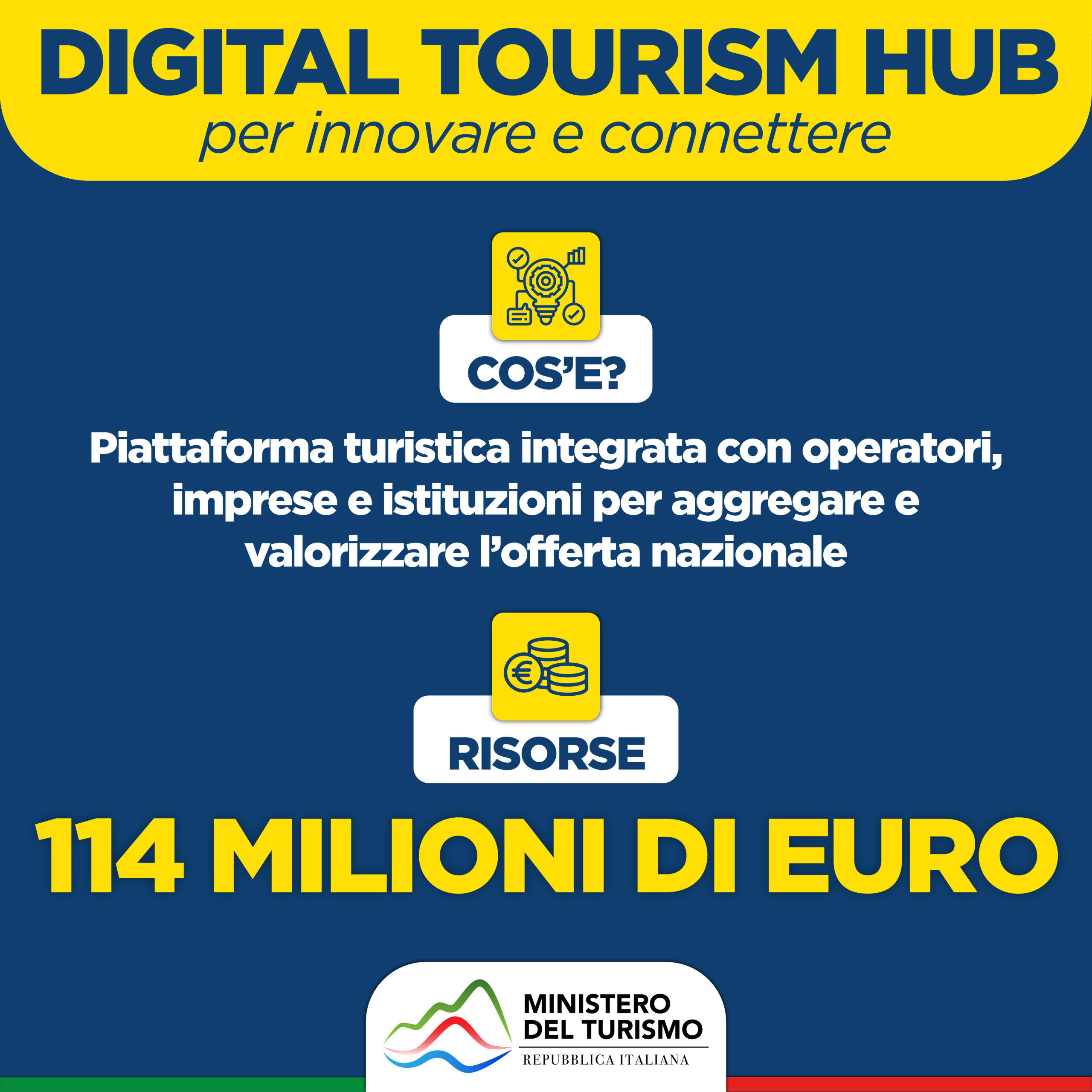 - 114 milioni per attivare il Digital Tourism Hub, vale a dire una piattaforma digitale per aggregare on line l’offerta turistica nazionale: seguirà misura amministrativa;