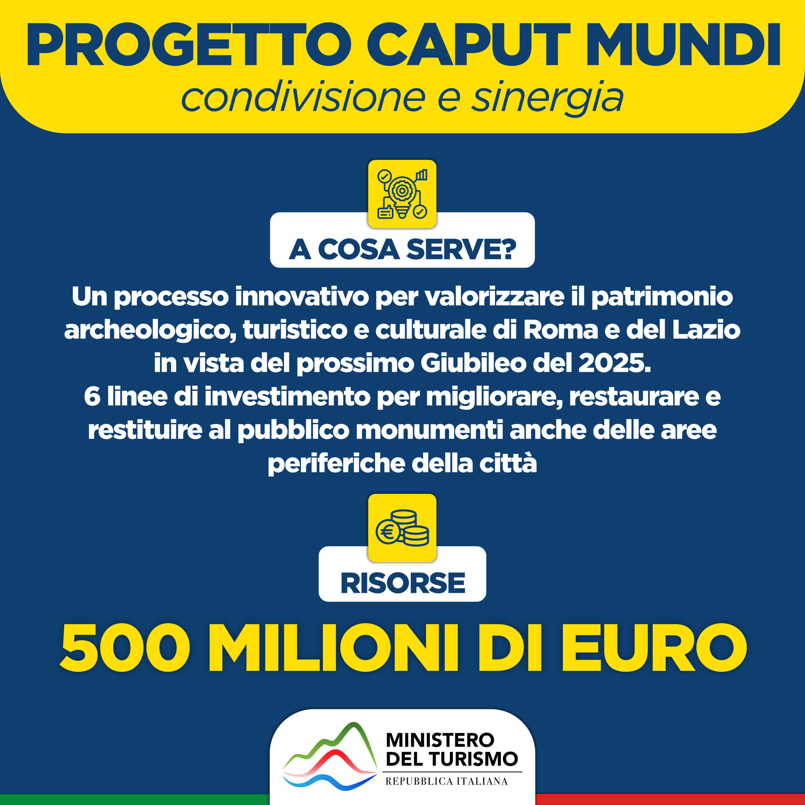 - 500 milioni per il progetto Caput Mundi, vale a dire interventi per sostenere da un punto di vista turistica l’offerta in vista del Giubileo: seguirà misura amministrativa.