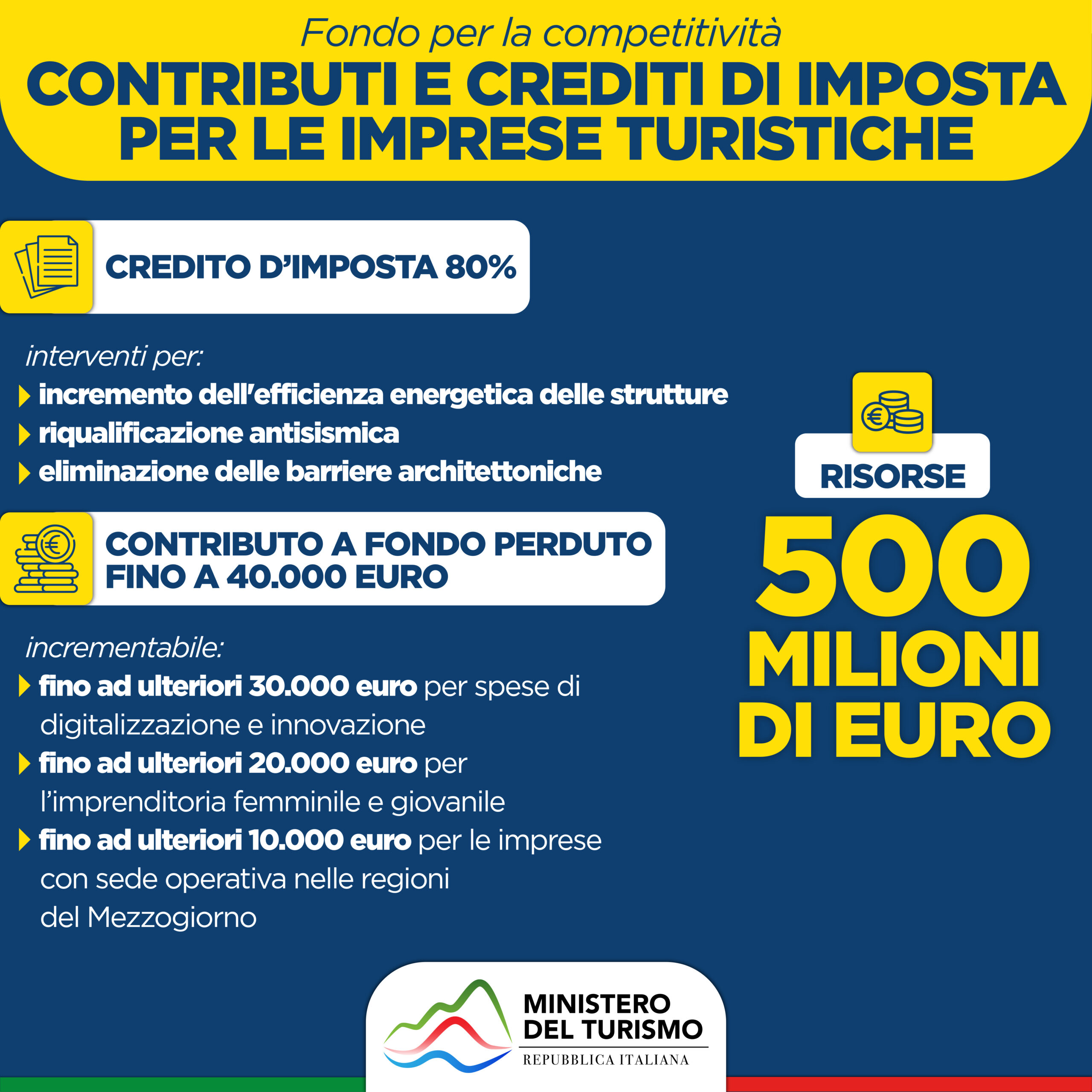 – 180 milioni fondo perduto e attivazione di un Fondo rotativo della Cdp per ammodernamento strutture, eliminazione barriere architettoniche, riqualificazione ambientale: misura contenuta nel decreto approvato oggi;