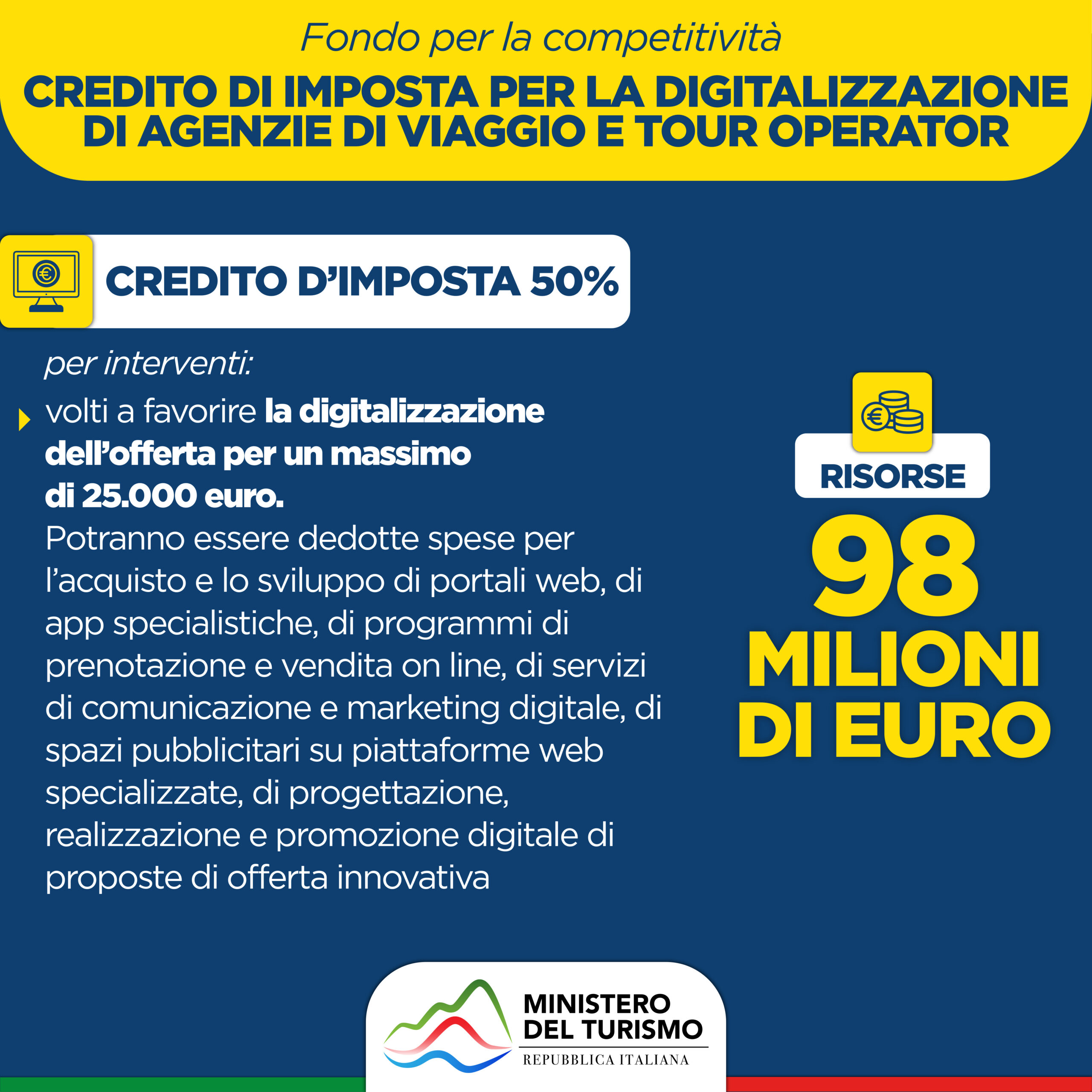 – 98 milioni per sostenere la digitalizzazione delle agenzie di viaggio e tour operator: misura contenuta nel decreto approvato oggi;